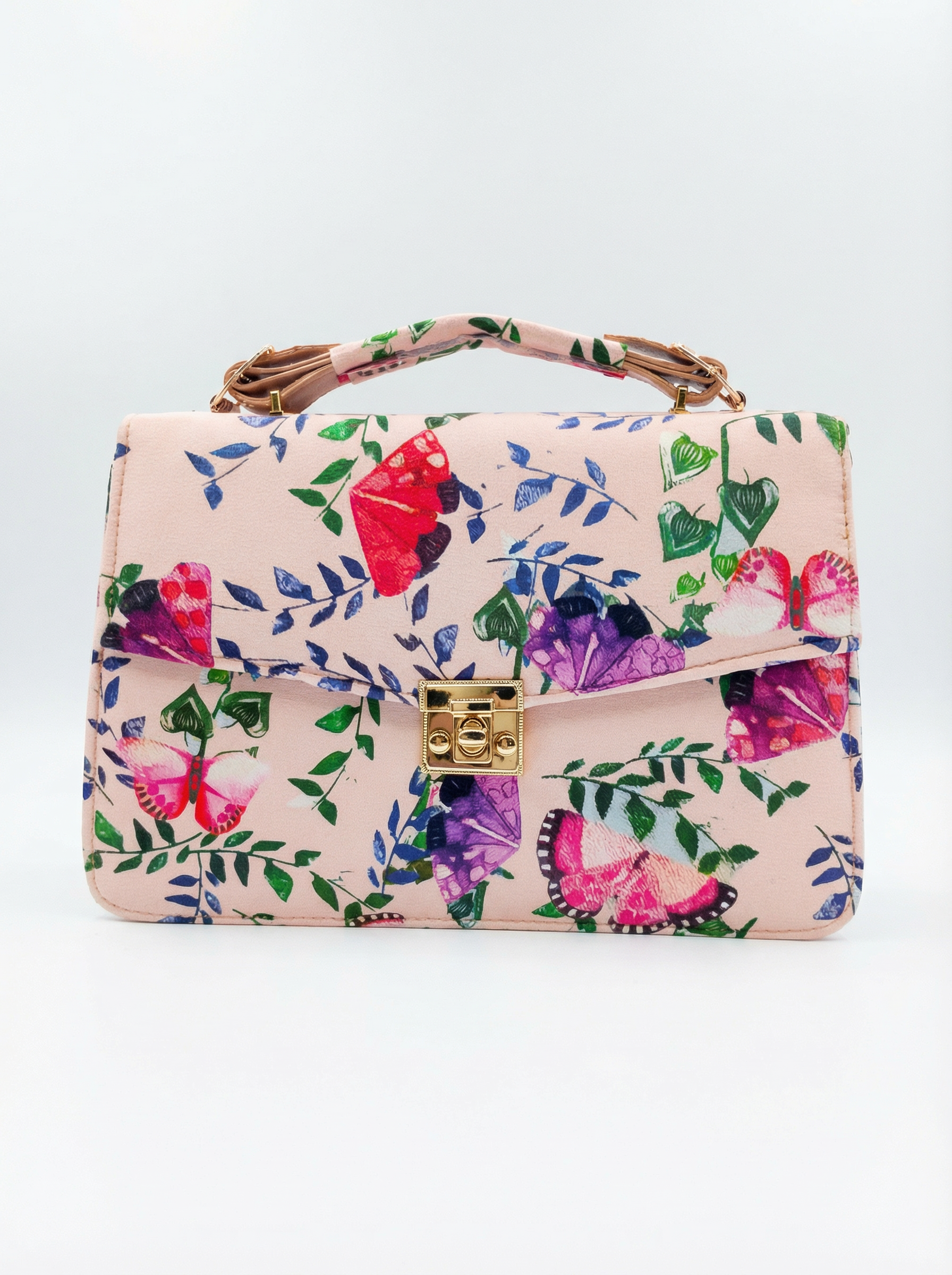 This bag is excellent for everyday use! A pink butterfly print velvet with handle. Includes a complementary belt for easy wear!